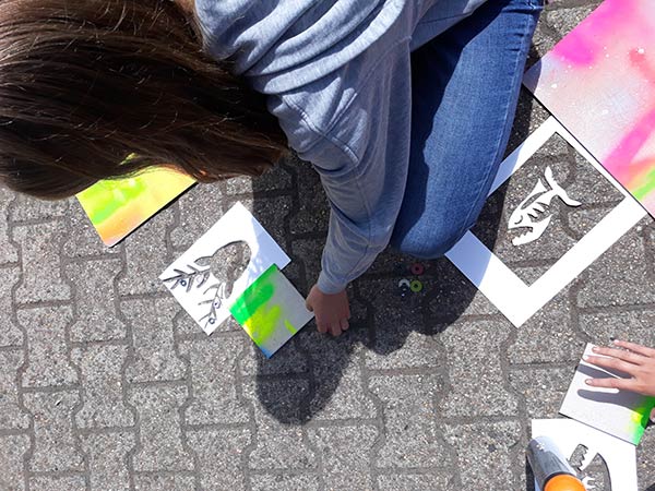 Hiermee maak je een sjabloon op ware grootte. Jouw ontwerp snijd je uit in papier. Buiten* spuit je je ontwerp, d.m.v. het sjabloon, met kalkspray op de straat.